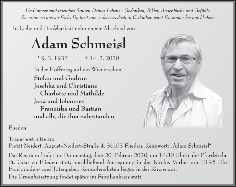 Hier finden Sie alle Traueranzeigen aus der Zeitung, die bisher für Adam Schmeisl erschienen sind. Weitere Traueranzeigen, die in der Zeitung erscheinen, werden hier ebenfalls aufgelistet