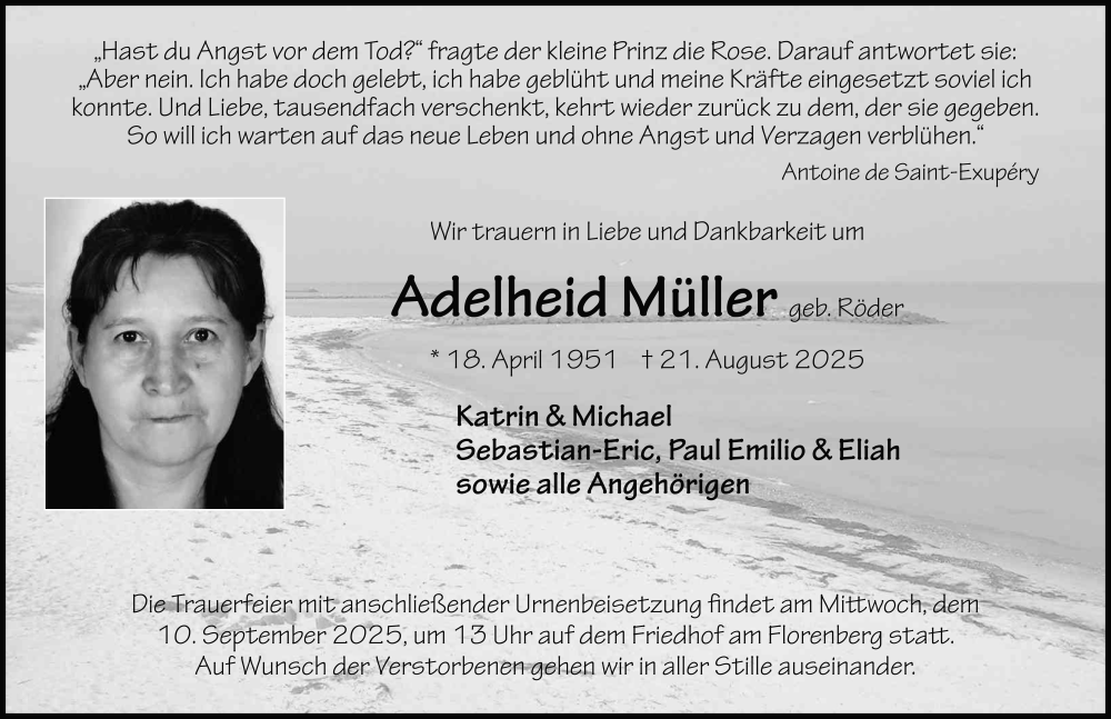 Hier finden Sie alle Traueranzeigen aus der Zeitung, die bisher für Adelheid Müller erschienen sind. Weitere Traueranzeigen, die in der Zeitung erscheinen, werden hier ebenfalls aufgelistet
