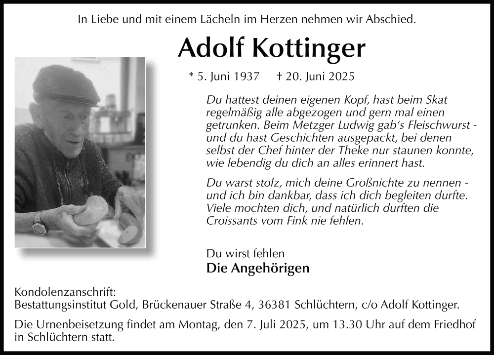 Hier finden Sie alle Traueranzeigen aus der Zeitung, die bisher für Adolf Kottinger erschienen sind. Weitere Traueranzeigen, die in der Zeitung erscheinen, werden hier ebenfalls aufgelistet