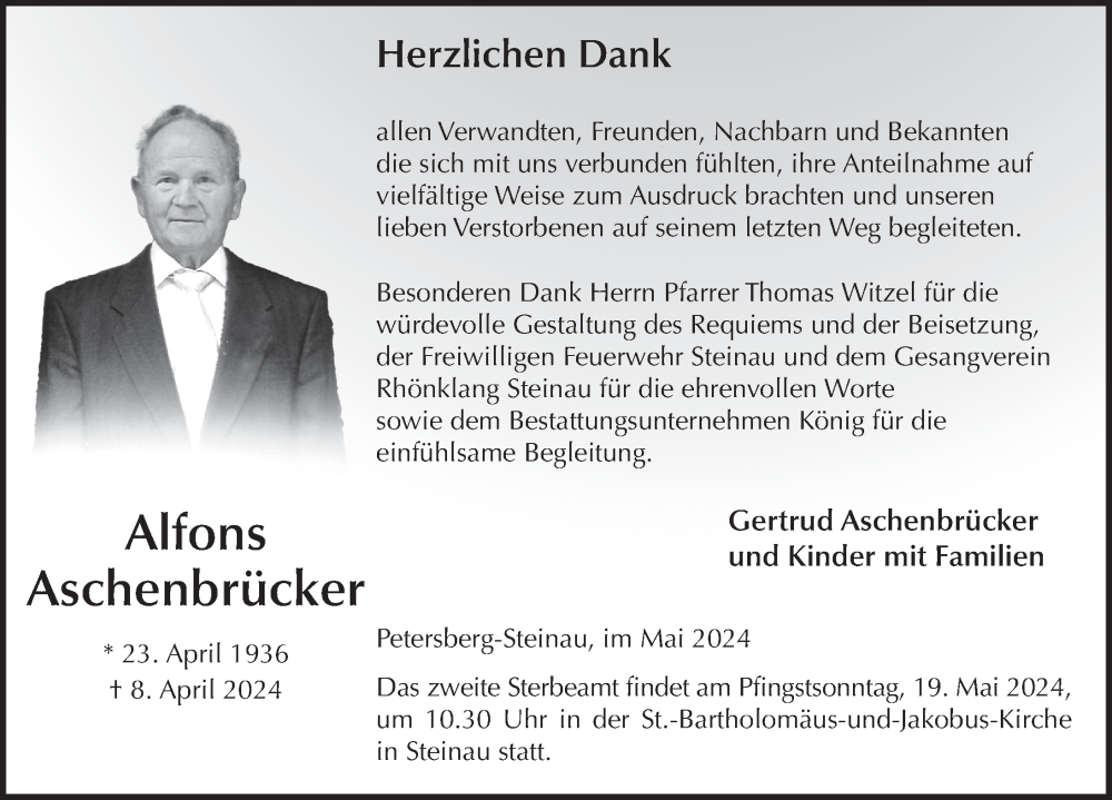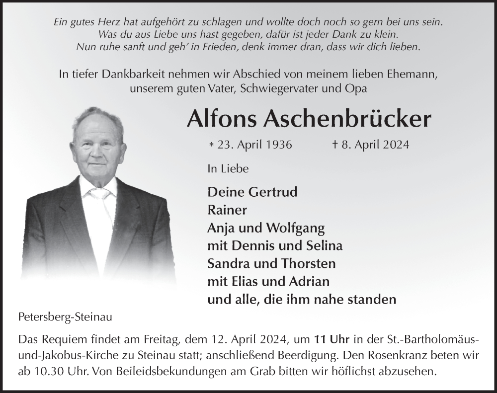 Hier finden Sie alle Traueranzeigen aus der Zeitung, die bisher für Alfons Aschenbrücker erschienen sind. Weitere Traueranzeigen, die in der Zeitung erscheinen, werden hier ebenfalls aufgelistet