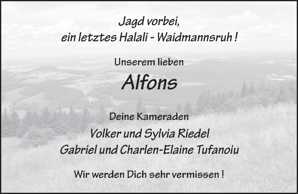 Hier finden Sie alle Traueranzeigen aus der Zeitung, die bisher für Alfons Diegelmann erschienen sind. Weitere Traueranzeigen, die in der Zeitung erscheinen, werden hier ebenfalls aufgelistet