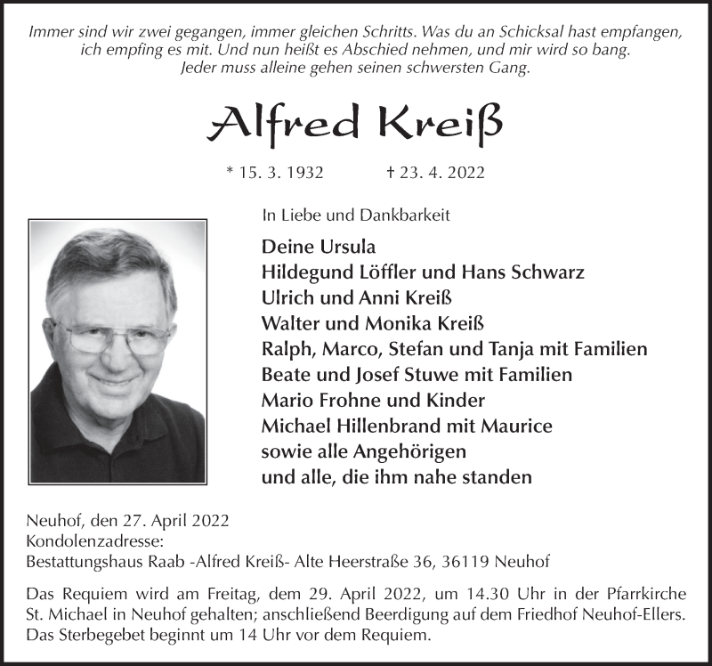 Hier finden Sie alle Traueranzeigen aus der Zeitung, die bisher für Alfred Kreiß erschienen sind. Weitere Traueranzeigen, die in der Zeitung erscheinen, werden hier ebenfalls aufgelistet