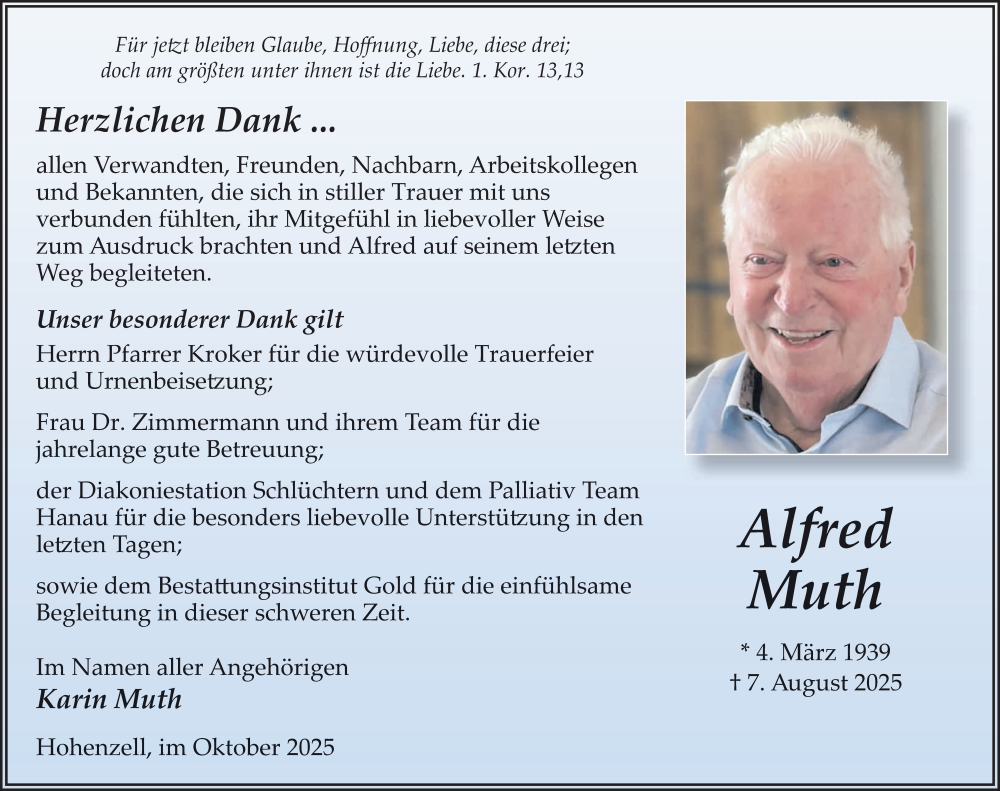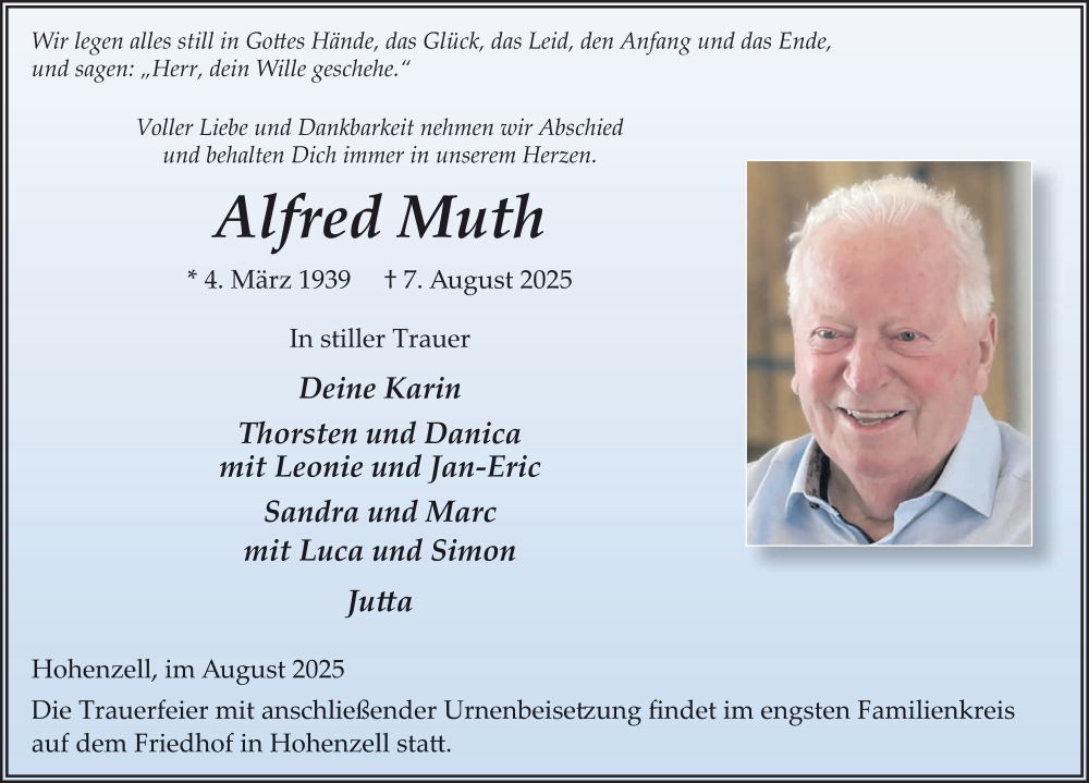 Hier finden Sie alle Traueranzeigen aus der Zeitung, die bisher für Alfred Muth erschienen sind. Weitere Traueranzeigen, die in der Zeitung erscheinen, werden hier ebenfalls aufgelistet