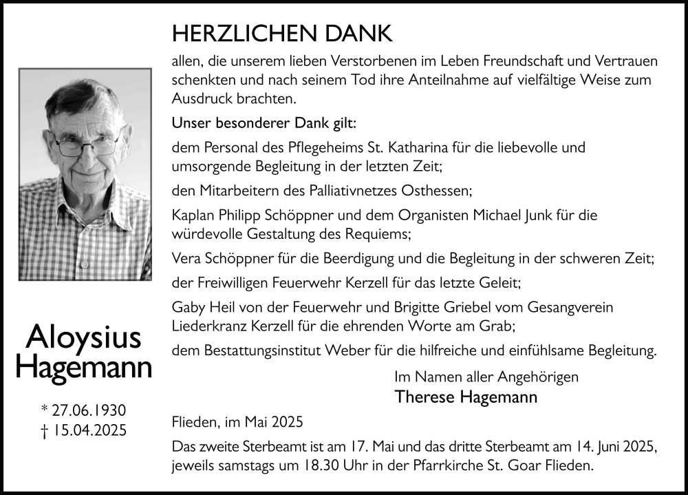Hier finden Sie alle Traueranzeigen aus der Zeitung, die bisher für Aloysius Hagemann erschienen sind. Weitere Traueranzeigen, die in der Zeitung erscheinen, werden hier ebenfalls aufgelistet