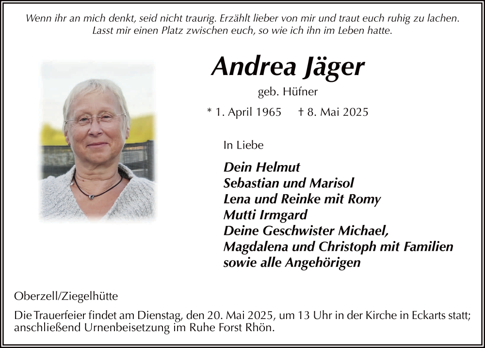 Hier finden Sie alle Traueranzeigen aus der Zeitung, die bisher für Andrea Jäger erschienen sind. Weitere Traueranzeigen, die in der Zeitung erscheinen, werden hier ebenfalls aufgelistet