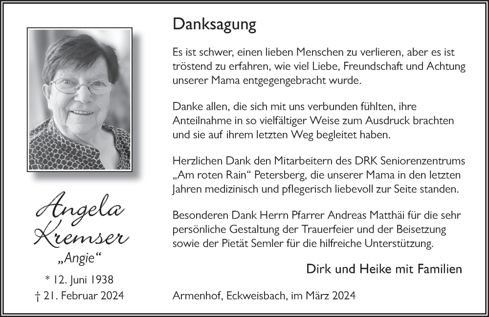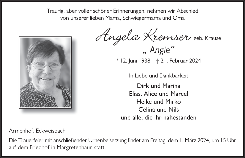 Hier finden Sie alle Traueranzeigen aus der Zeitung, die bisher für Angela Kremser erschienen sind. Weitere Traueranzeigen, die in der Zeitung erscheinen, werden hier ebenfalls aufgelistet