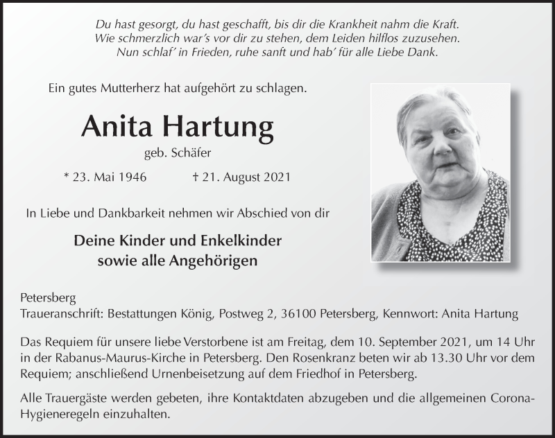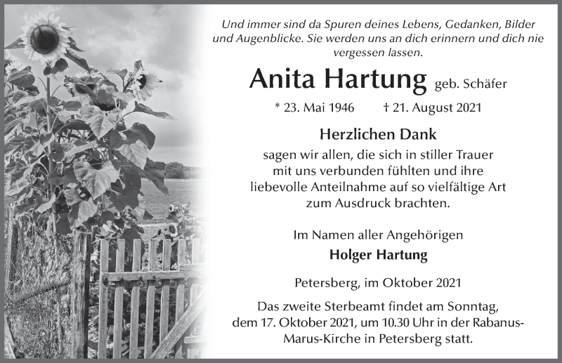 Hier finden Sie alle Traueranzeigen aus der Zeitung, die bisher für Anita Hartung erschienen sind. Weitere Traueranzeigen, die in der Zeitung erscheinen, werden hier ebenfalls aufgelistet