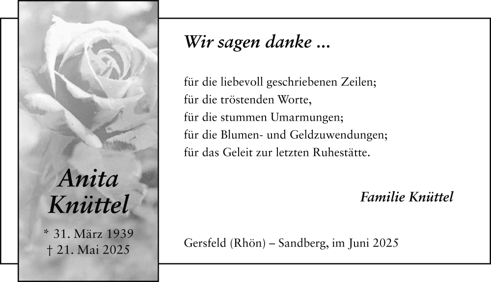 Hier finden Sie alle Traueranzeigen aus der Zeitung, die bisher für Anita Knüttel erschienen sind. Weitere Traueranzeigen, die in der Zeitung erscheinen, werden hier ebenfalls aufgelistet