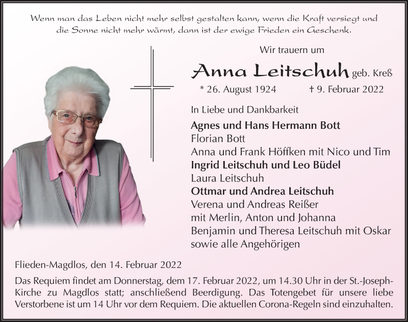 Hier finden Sie alle Traueranzeigen aus der Zeitung, die bisher für Anna Leitschuh erschienen sind. Weitere Traueranzeigen, die in der Zeitung erscheinen, werden hier ebenfalls aufgelistet