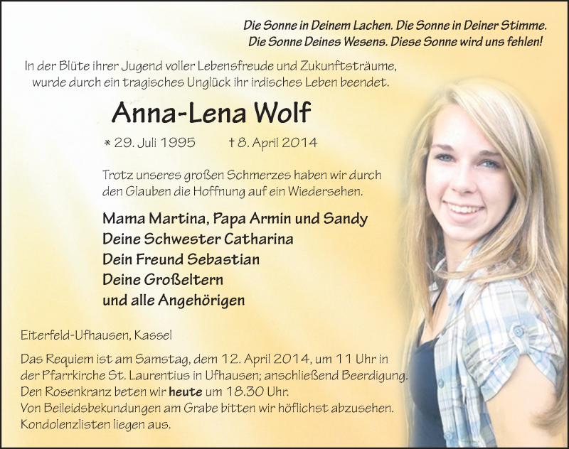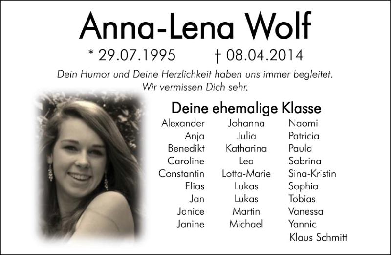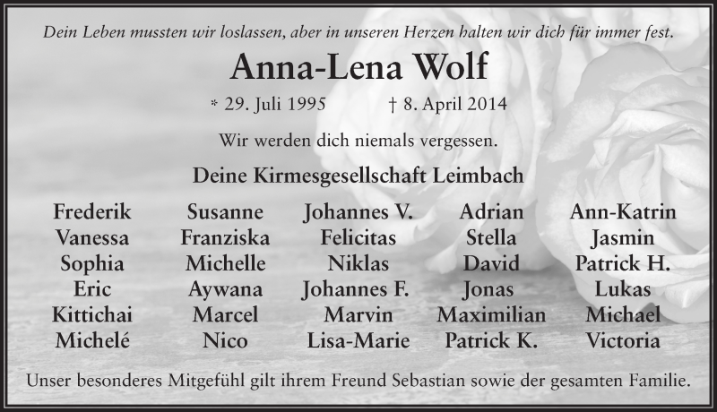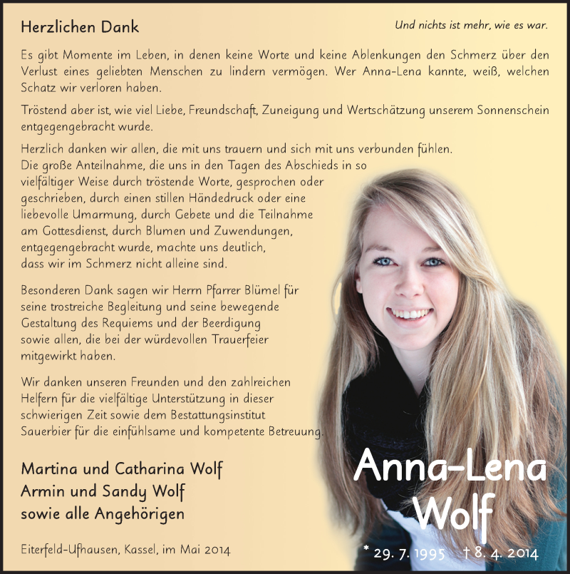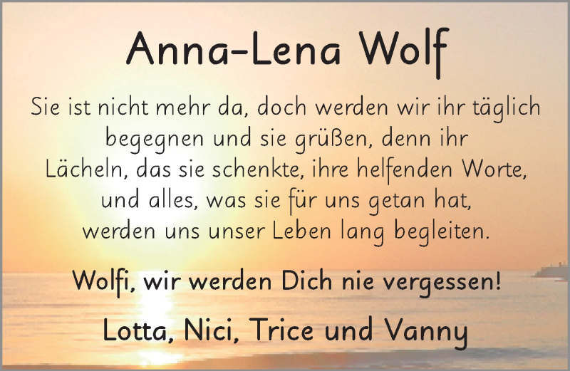Hier finden Sie alle Traueranzeigen aus der Zeitung, die bisher für Anna-Lena Wolf erschienen sind. Weitere Traueranzeigen, die in der Zeitung erscheinen, werden hier ebenfalls aufgelistet