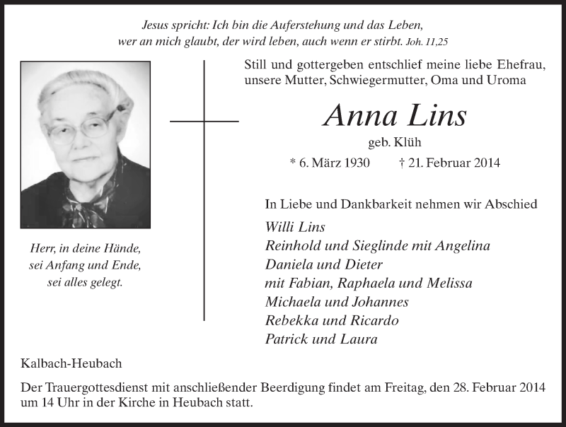 Hier finden Sie alle Traueranzeigen aus der Zeitung, die bisher für Anna Lins erschienen sind. Weitere Traueranzeigen, die in der Zeitung erscheinen, werden hier ebenfalls aufgelistet