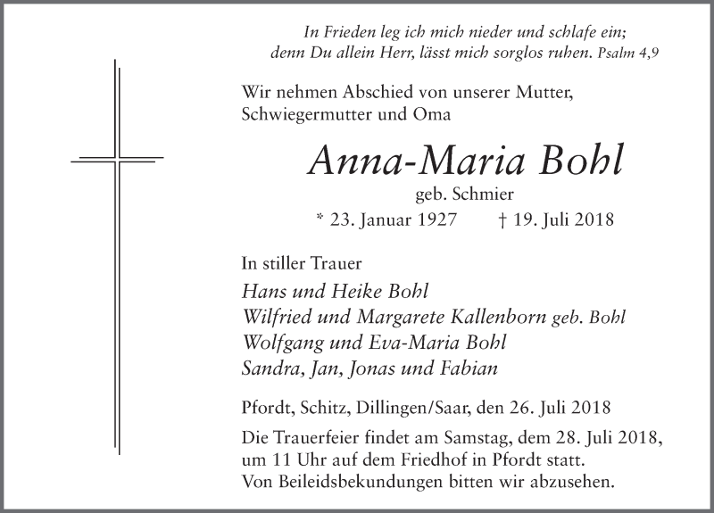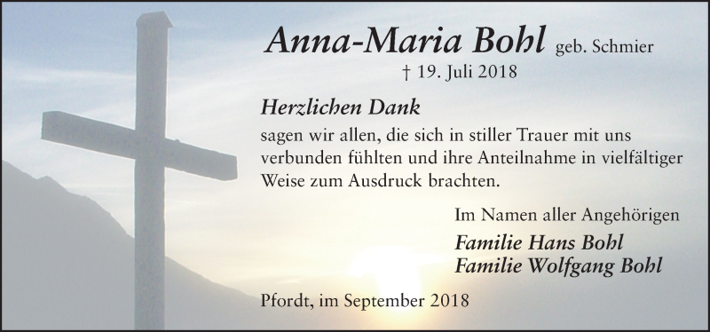 Hier finden Sie alle Traueranzeigen aus der Zeitung, die bisher für Anna-Maria Bohl erschienen sind. Weitere Traueranzeigen, die in der Zeitung erscheinen, werden hier ebenfalls aufgelistet