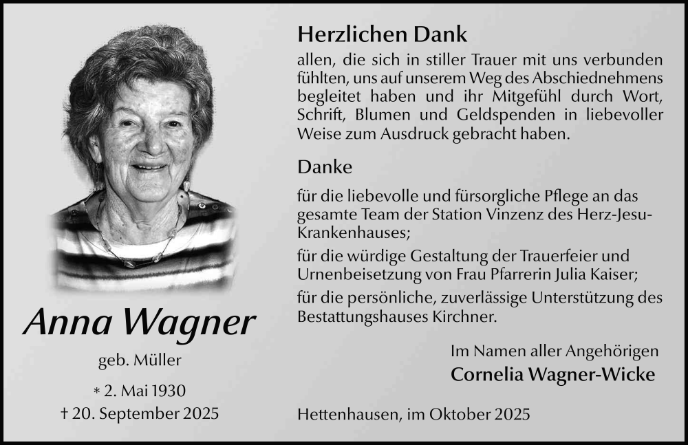 Hier finden Sie alle Traueranzeigen aus der Zeitung, die bisher für Anna Wagner erschienen sind. Weitere Traueranzeigen, die in der Zeitung erscheinen, werden hier ebenfalls aufgelistet