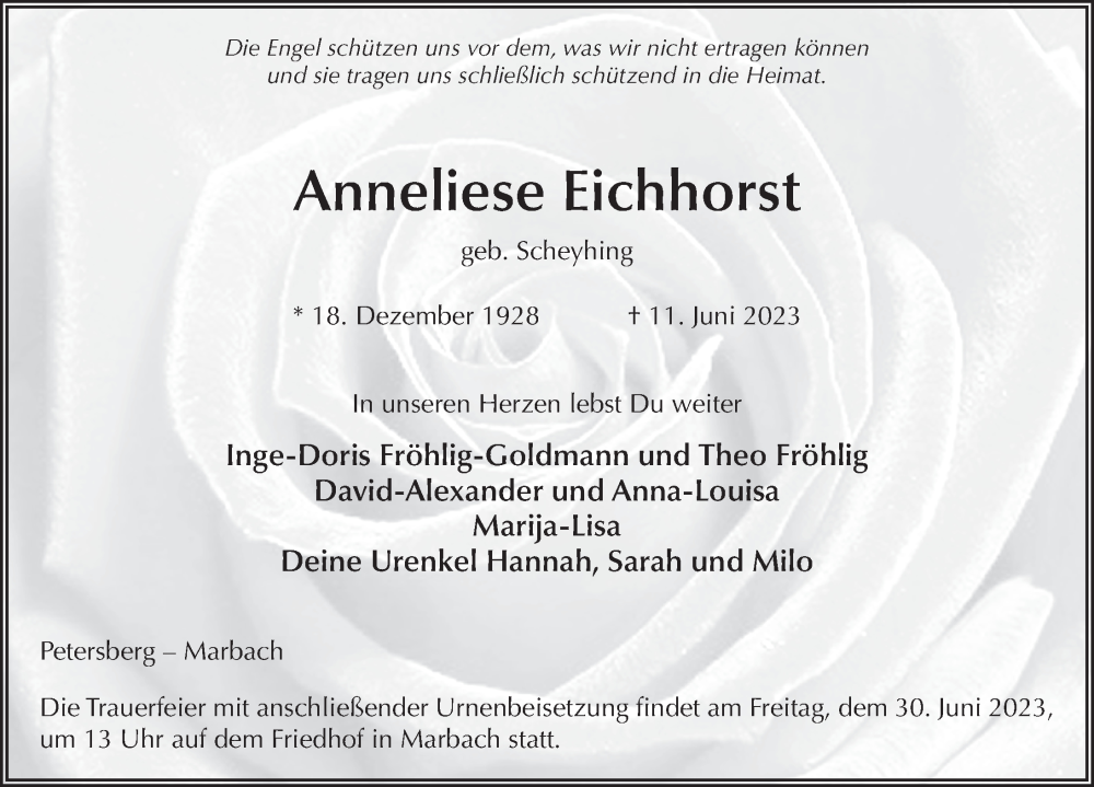 Hier finden Sie alle Traueranzeigen aus der Zeitung, die bisher für Anneliese Eichhorst erschienen sind. Weitere Traueranzeigen, die in der Zeitung erscheinen, werden hier ebenfalls aufgelistet