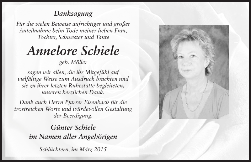 Hier finden Sie alle Traueranzeigen aus der Zeitung, die bisher für Annelore Schiele erschienen sind. Weitere Traueranzeigen, die in der Zeitung erscheinen, werden hier ebenfalls aufgelistet