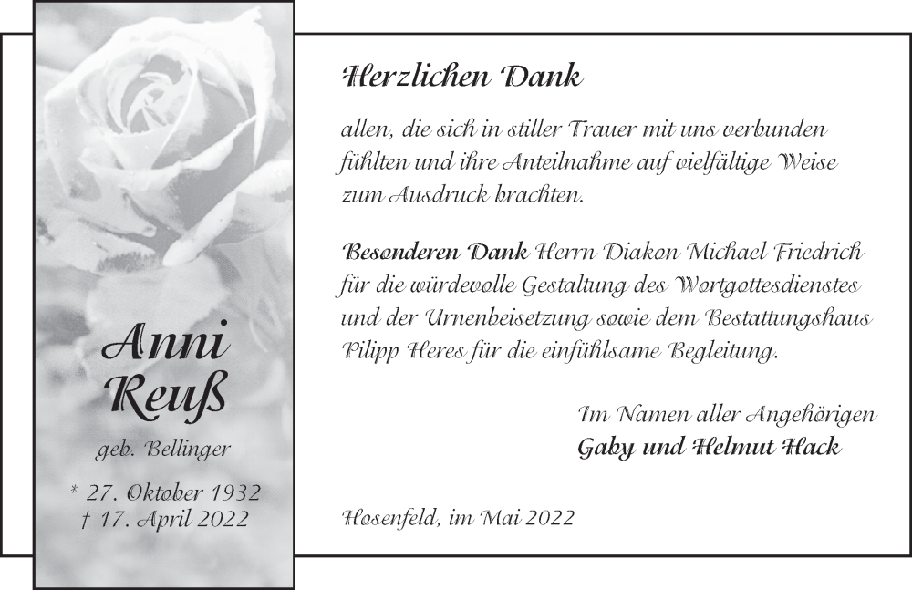 Hier finden Sie alle Traueranzeigen aus der Zeitung, die bisher für Anni Reuß erschienen sind. Weitere Traueranzeigen, die in der Zeitung erscheinen, werden hier ebenfalls aufgelistet