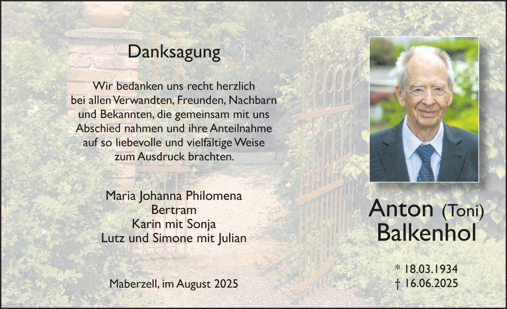 Hier finden Sie alle Traueranzeigen aus der Zeitung, die bisher für Anton Balkenhol erschienen sind. Weitere Traueranzeigen, die in der Zeitung erscheinen, werden hier ebenfalls aufgelistet