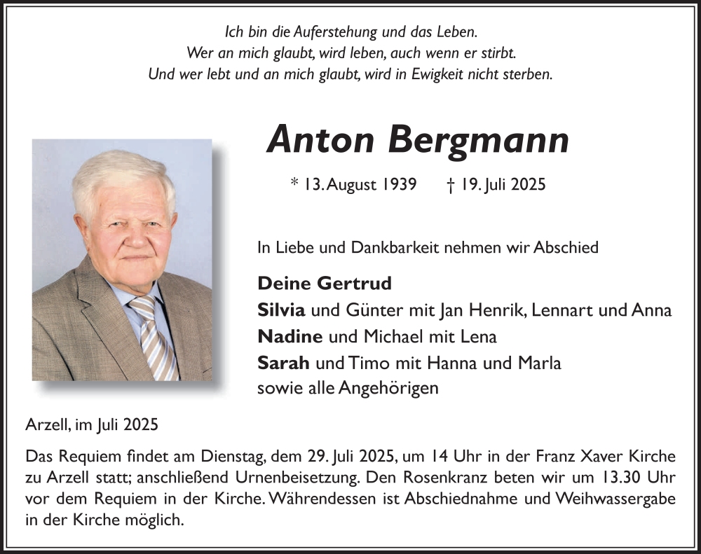 Hier finden Sie alle Traueranzeigen aus der Zeitung, die bisher für Anton Bergmann erschienen sind. Weitere Traueranzeigen, die in der Zeitung erscheinen, werden hier ebenfalls aufgelistet