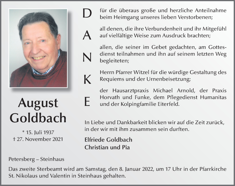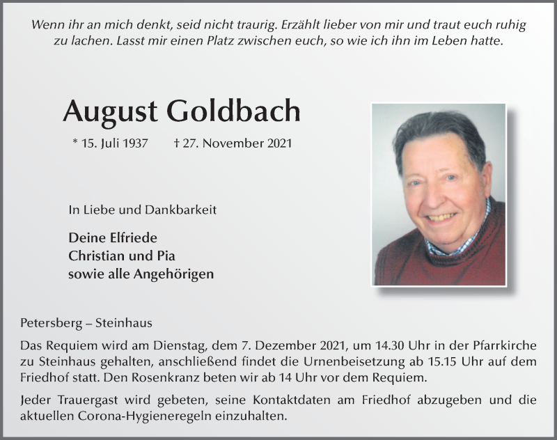 Hier finden Sie alle Traueranzeigen aus der Zeitung, die bisher für August Goldbach erschienen sind. Weitere Traueranzeigen, die in der Zeitung erscheinen, werden hier ebenfalls aufgelistet