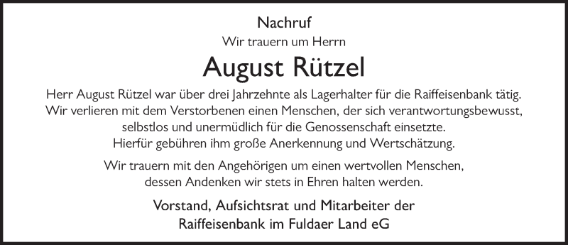 Hier finden Sie alle Traueranzeigen aus der Zeitung, die bisher für August Rützel erschienen sind. Weitere Traueranzeigen, die in der Zeitung erscheinen, werden hier ebenfalls aufgelistet