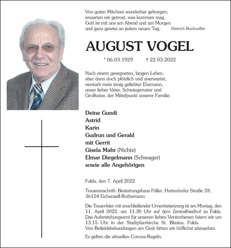 Hier finden Sie alle Traueranzeigen aus der Zeitung, die bisher für August Vogel erschienen sind. Weitere Traueranzeigen, die in der Zeitung erscheinen, werden hier ebenfalls aufgelistet