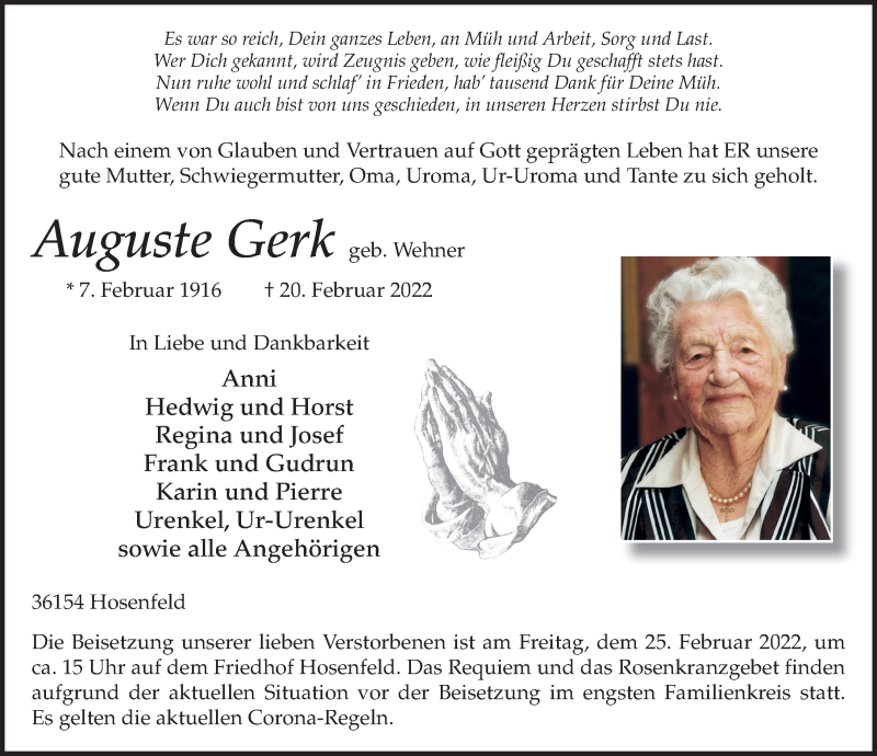 Hier finden Sie alle Traueranzeigen aus der Zeitung, die bisher für Auguste Gerk erschienen sind. Weitere Traueranzeigen, die in der Zeitung erscheinen, werden hier ebenfalls aufgelistet