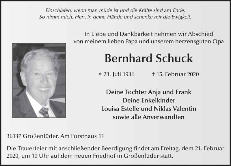 Hier finden Sie alle Traueranzeigen aus der Zeitung, die bisher für Bernhard Schuck erschienen sind. Weitere Traueranzeigen, die in der Zeitung erscheinen, werden hier ebenfalls aufgelistet