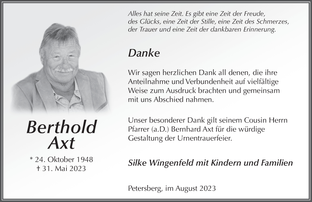 Hier finden Sie alle Traueranzeigen aus der Zeitung, die bisher für Berthold Axt erschienen sind. Weitere Traueranzeigen, die in der Zeitung erscheinen, werden hier ebenfalls aufgelistet