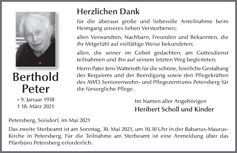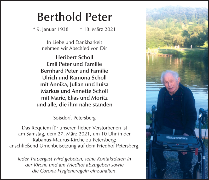Hier finden Sie alle Traueranzeigen aus der Zeitung, die bisher für Berthold Peter erschienen sind. Weitere Traueranzeigen, die in der Zeitung erscheinen, werden hier ebenfalls aufgelistet