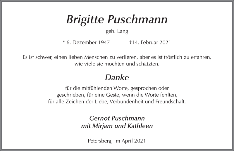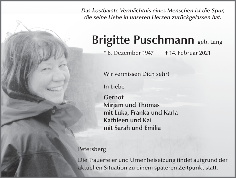 Hier finden Sie alle Traueranzeigen aus der Zeitung, die bisher für Brigitte Puschmann erschienen sind. Weitere Traueranzeigen, die in der Zeitung erscheinen, werden hier ebenfalls aufgelistet