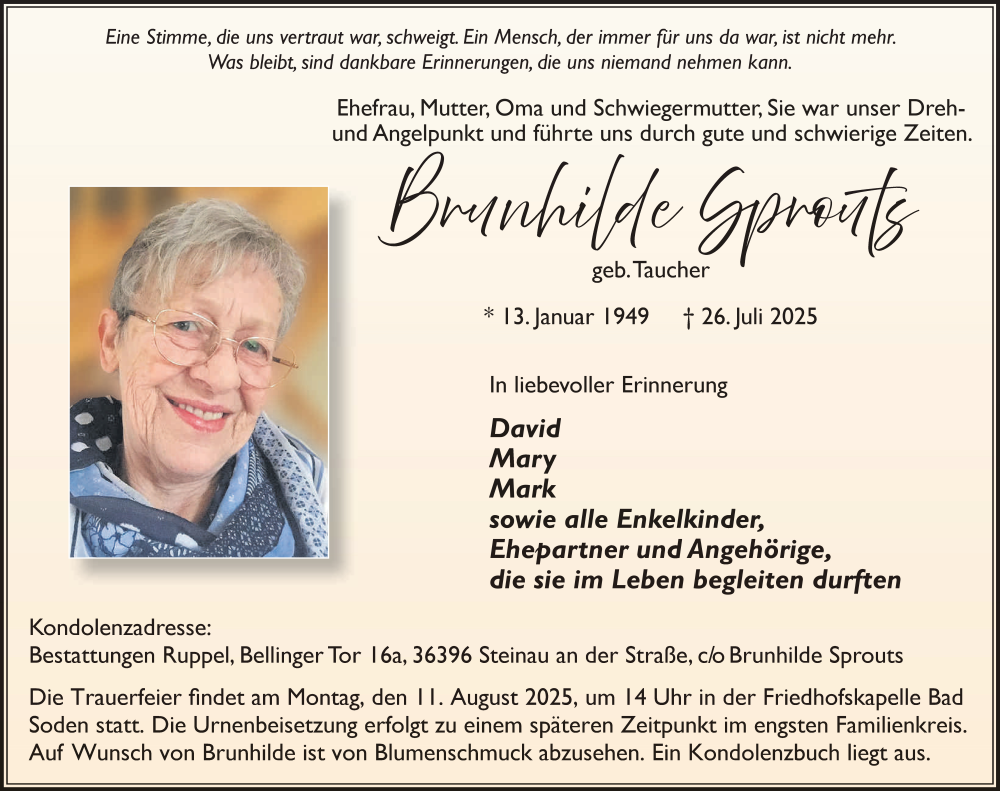 Hier finden Sie alle Traueranzeigen aus der Zeitung, die bisher für Brunhilde Sprouts erschienen sind. Weitere Traueranzeigen, die in der Zeitung erscheinen, werden hier ebenfalls aufgelistet