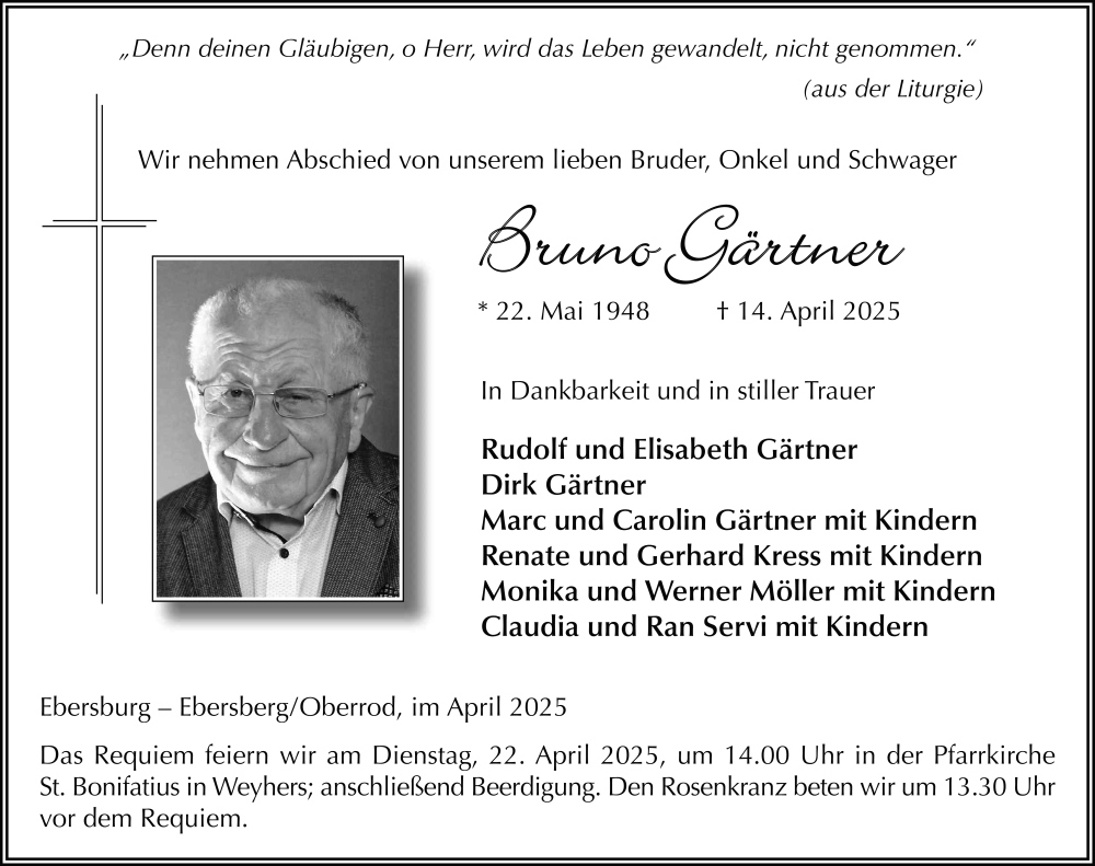 Hier finden Sie alle Traueranzeigen aus der Zeitung, die bisher für Bruno Gärtner erschienen sind. Weitere Traueranzeigen, die in der Zeitung erscheinen, werden hier ebenfalls aufgelistet