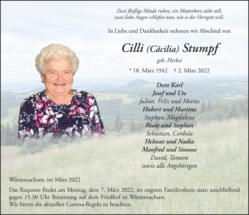 Hier finden Sie alle Traueranzeigen aus der Zeitung, die bisher für Cäcilia Stumpf erschienen sind. Weitere Traueranzeigen, die in der Zeitung erscheinen, werden hier ebenfalls aufgelistet