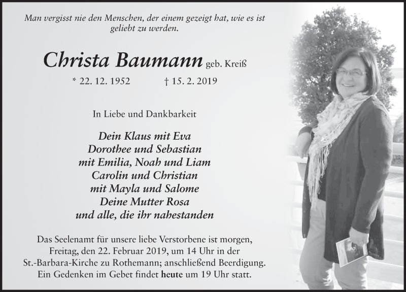 Hier finden Sie alle Traueranzeigen aus der Zeitung, die bisher für Christa Baumann erschienen sind. Weitere Traueranzeigen, die in der Zeitung erscheinen, werden hier ebenfalls aufgelistet