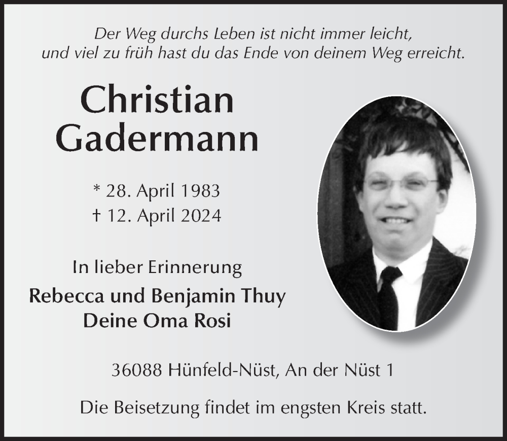 Hier finden Sie alle Traueranzeigen aus der Zeitung, die bisher für Christian Gadermann erschienen sind. Weitere Traueranzeigen, die in der Zeitung erscheinen, werden hier ebenfalls aufgelistet