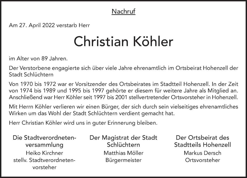 Hier finden Sie alle Traueranzeigen aus der Zeitung, die bisher für Christian Köhler erschienen sind. Weitere Traueranzeigen, die in der Zeitung erscheinen, werden hier ebenfalls aufgelistet