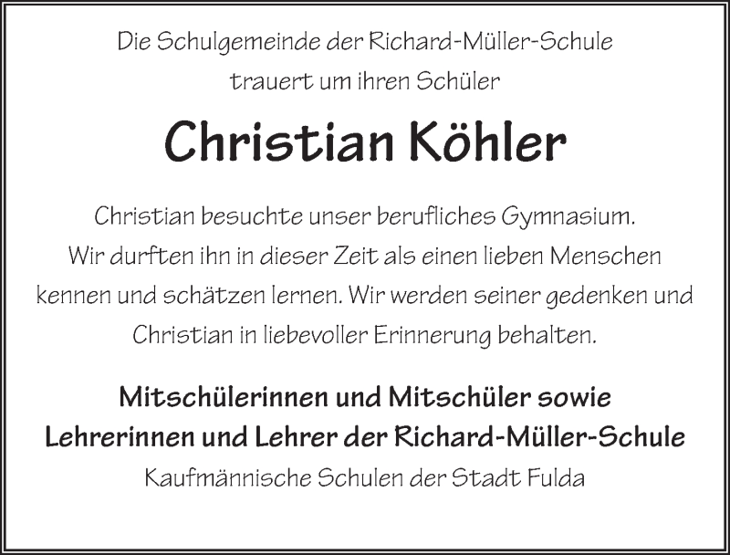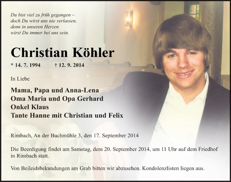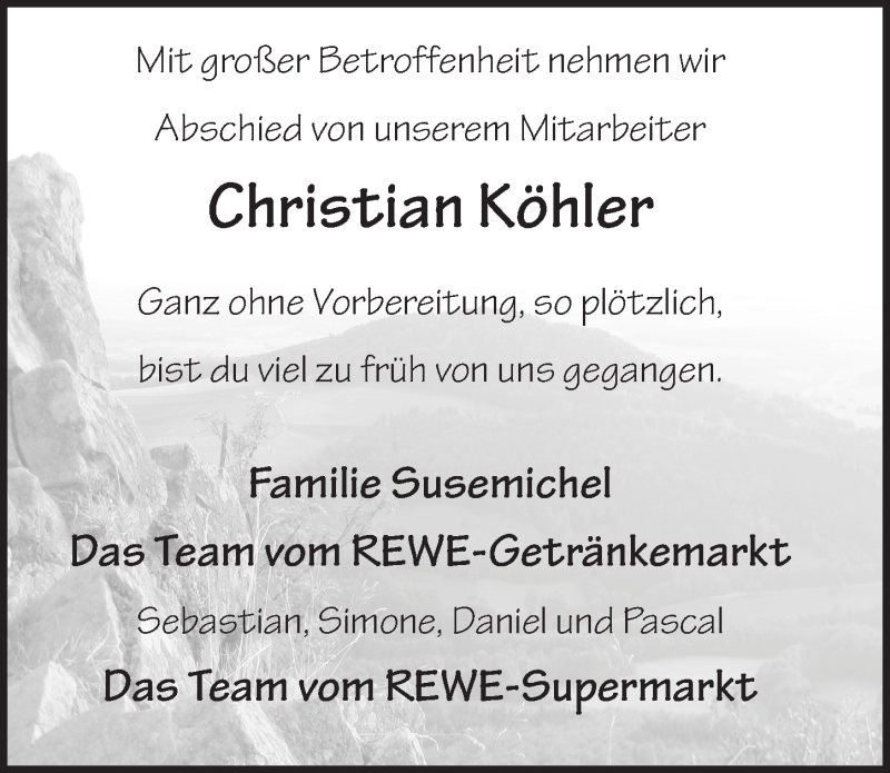 Hier finden Sie alle Traueranzeigen aus der Zeitung, die bisher für Christian Köhler erschienen sind. Weitere Traueranzeigen, die in der Zeitung erscheinen, werden hier ebenfalls aufgelistet