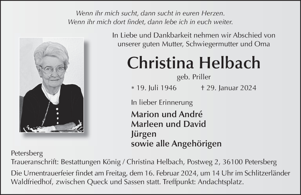 Hier finden Sie alle Traueranzeigen aus der Zeitung, die bisher für Christina Helbach erschienen sind. Weitere Traueranzeigen, die in der Zeitung erscheinen, werden hier ebenfalls aufgelistet