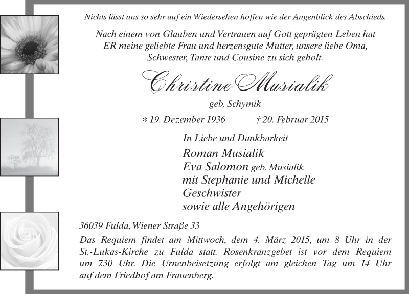 Hier finden Sie alle Traueranzeigen aus der Zeitung, die bisher für Christine Musialik erschienen sind. Weitere Traueranzeigen, die in der Zeitung erscheinen, werden hier ebenfalls aufgelistet