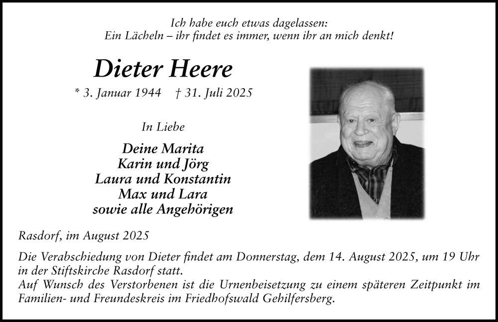 Hier finden Sie alle Traueranzeigen aus der Zeitung, die bisher für Dieter Heere erschienen sind. Weitere Traueranzeigen, die in der Zeitung erscheinen, werden hier ebenfalls aufgelistet