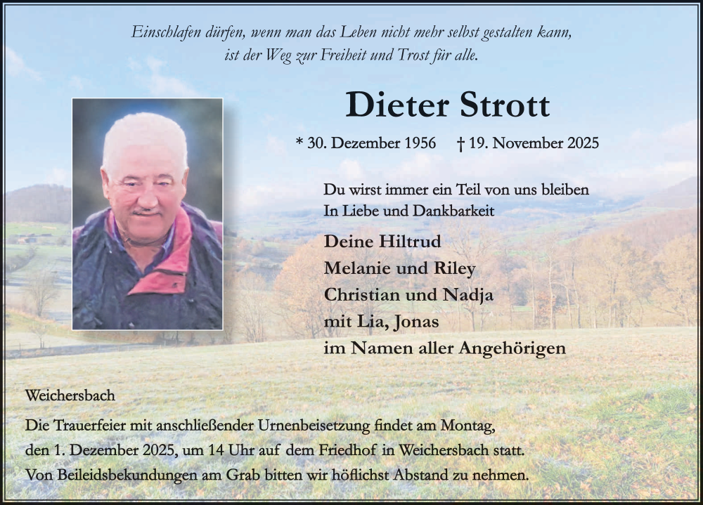 Hier finden Sie alle Traueranzeigen aus der Zeitung, die bisher für Dieter Strott erschienen sind. Weitere Traueranzeigen, die in der Zeitung erscheinen, werden hier ebenfalls aufgelistet