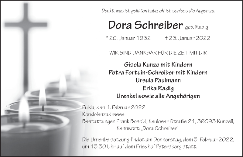 Hier finden Sie alle Traueranzeigen aus der Zeitung, die bisher für Dora Schreiber erschienen sind. Weitere Traueranzeigen, die in der Zeitung erscheinen, werden hier ebenfalls aufgelistet