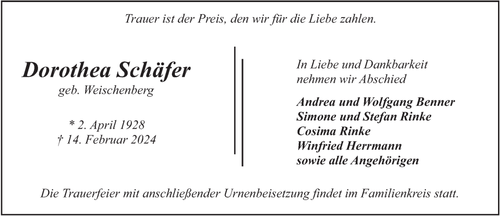 Hier finden Sie alle Traueranzeigen aus der Zeitung, die bisher für Dorothea Schäfer erschienen sind. Weitere Traueranzeigen, die in der Zeitung erscheinen, werden hier ebenfalls aufgelistet