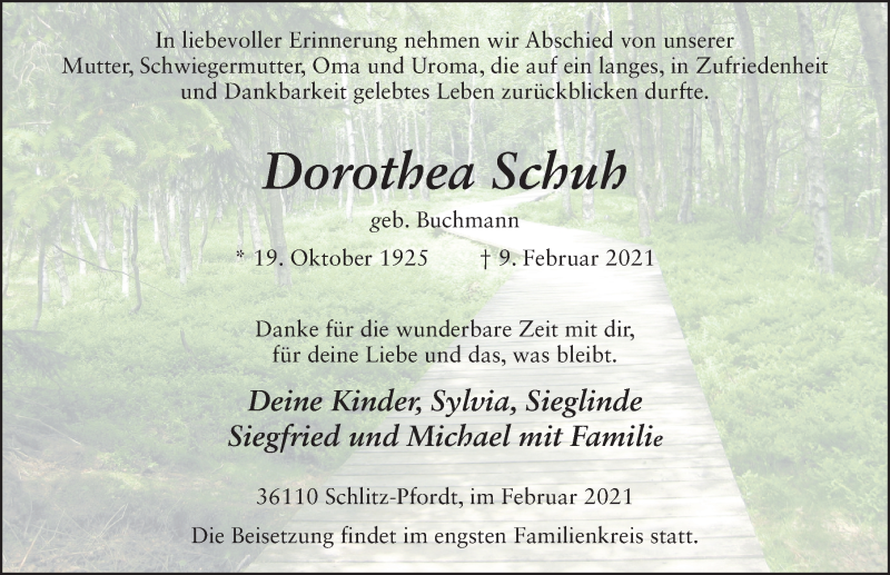 Hier finden Sie alle Traueranzeigen aus der Zeitung, die bisher für Dorothea Schuh erschienen sind. Weitere Traueranzeigen, die in der Zeitung erscheinen, werden hier ebenfalls aufgelistet