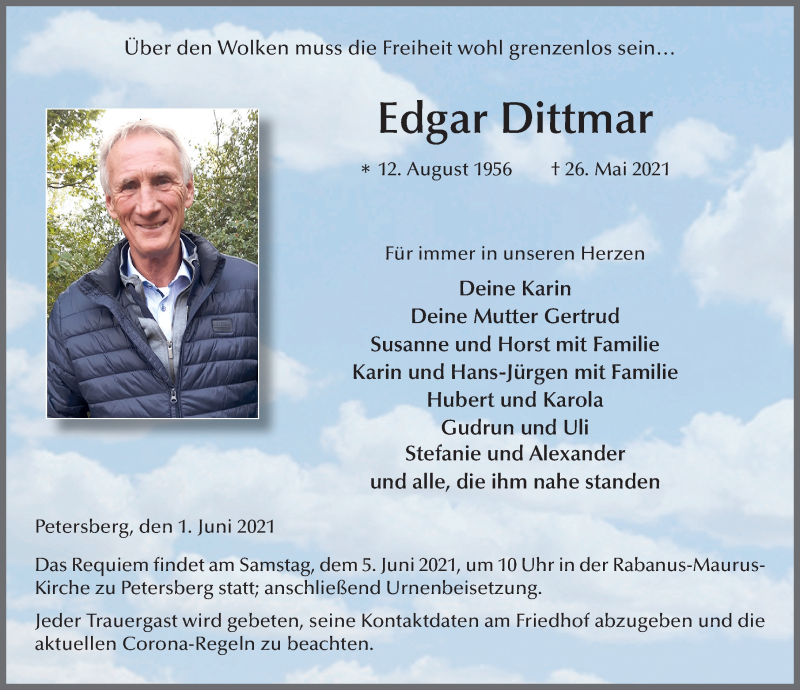 Hier finden Sie alle Traueranzeigen aus der Zeitung, die bisher für Edgar Dittmar erschienen sind. Weitere Traueranzeigen, die in der Zeitung erscheinen, werden hier ebenfalls aufgelistet