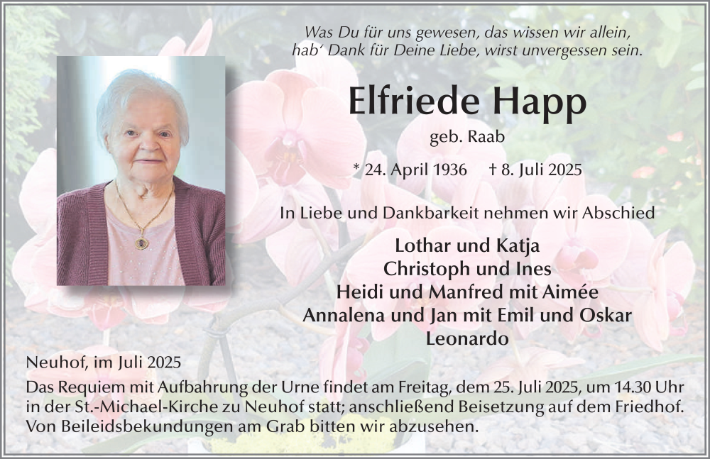 Hier finden Sie alle Traueranzeigen aus der Zeitung, die bisher für Elfriede Happ erschienen sind. Weitere Traueranzeigen, die in der Zeitung erscheinen, werden hier ebenfalls aufgelistet