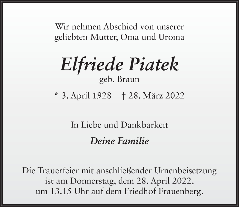 Hier finden Sie alle Traueranzeigen aus der Zeitung, die bisher für Elfriede Piatek erschienen sind. Weitere Traueranzeigen, die in der Zeitung erscheinen, werden hier ebenfalls aufgelistet