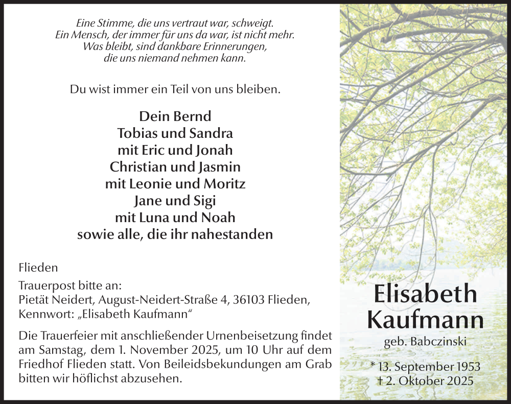 Hier finden Sie alle Traueranzeigen aus der Zeitung, die bisher für Elisabeth Kaufmann erschienen sind. Weitere Traueranzeigen, die in der Zeitung erscheinen, werden hier ebenfalls aufgelistet