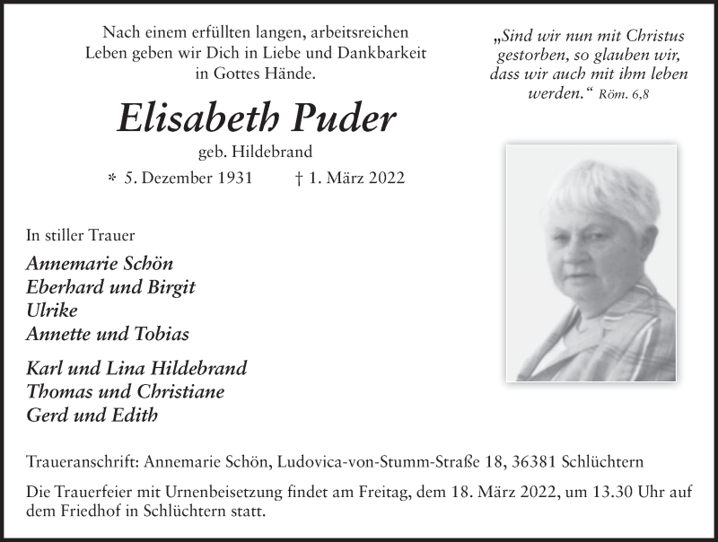 Hier finden Sie alle Traueranzeigen aus der Zeitung, die bisher für Elisabeth Puder erschienen sind. Weitere Traueranzeigen, die in der Zeitung erscheinen, werden hier ebenfalls aufgelistet
