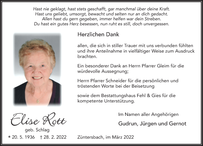 Hier finden Sie alle Traueranzeigen aus der Zeitung, die bisher für Elise Rott erschienen sind. Weitere Traueranzeigen, die in der Zeitung erscheinen, werden hier ebenfalls aufgelistet